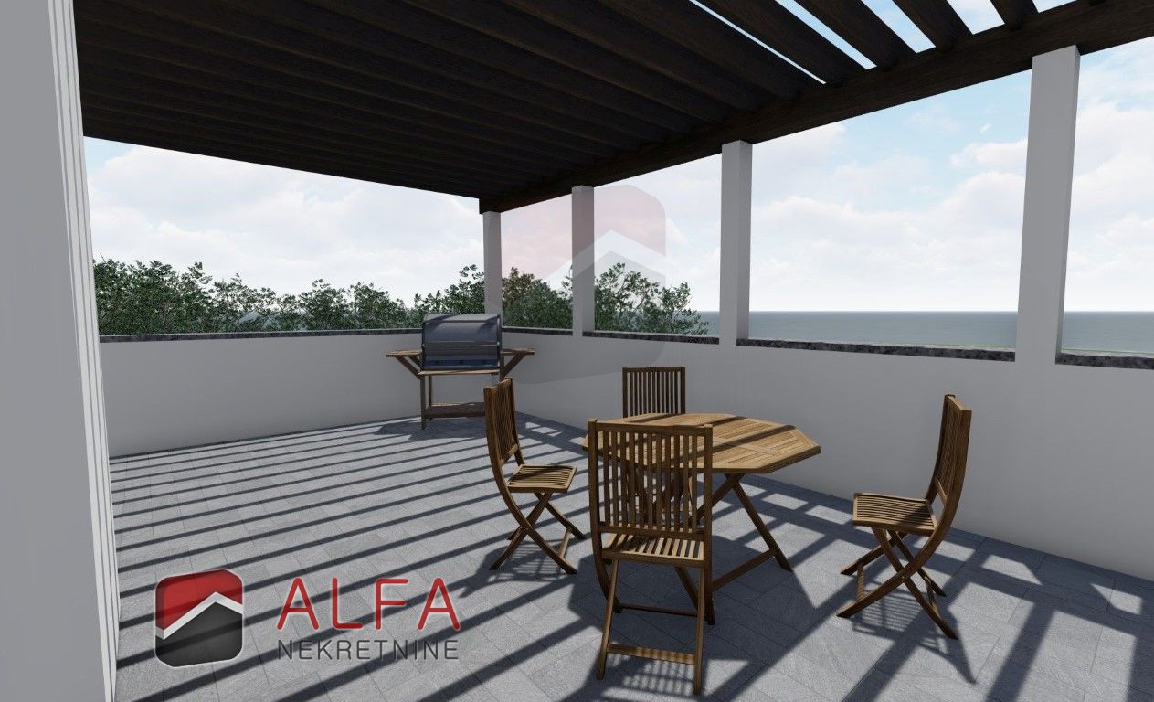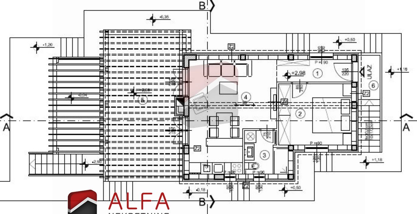 An external staircase leads to the apartment on the first floor which, according to the project, consists of a hallway, one bedroom, bathroom, kitchen with dining room and living room and beautiful spacious terrace.