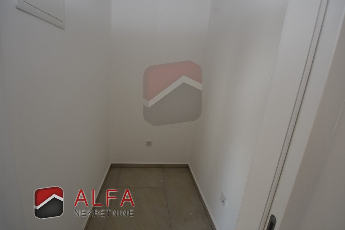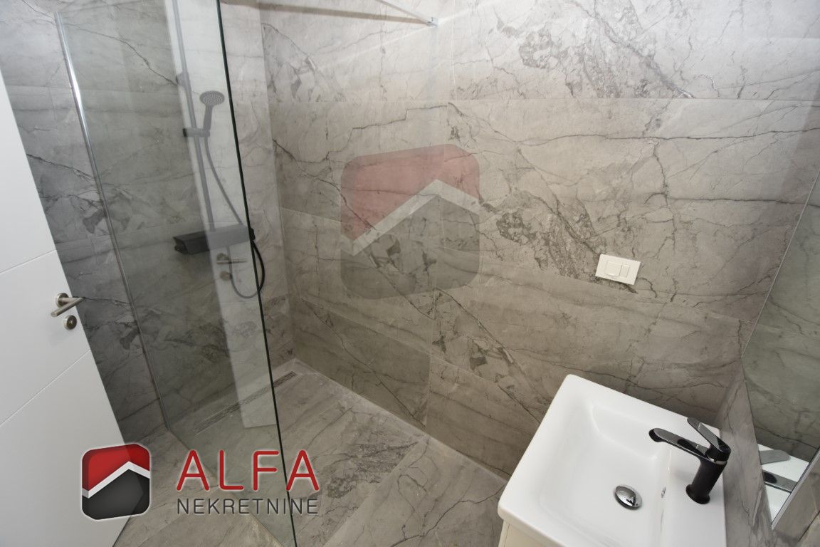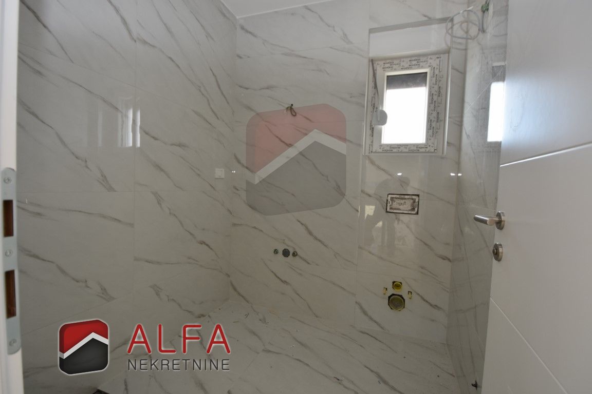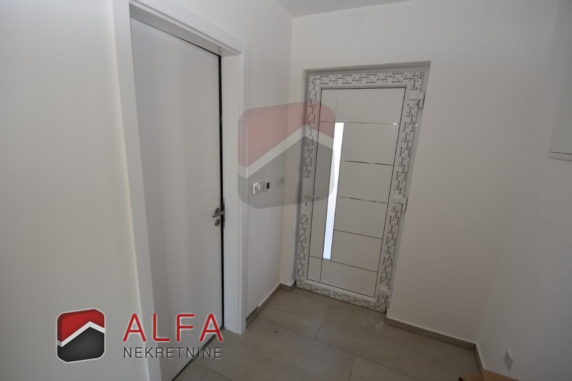 On the ground floor is covered entrance, hallway, bathroom, storage room, one bedroom, a kitchen with connected dining and living room with access to the terrace next to which is a separate summer kitchen. In front of and around the terrace is a garden with a swimming pool. Internal stairs lead to the first floor, where is a hallway, a bathroom, three bedrooms, one of which has its own bathroom. All three rooms have their own balcony.