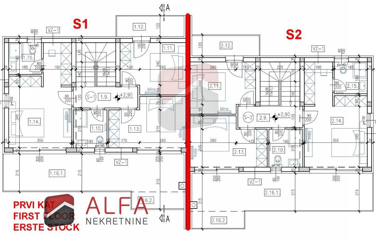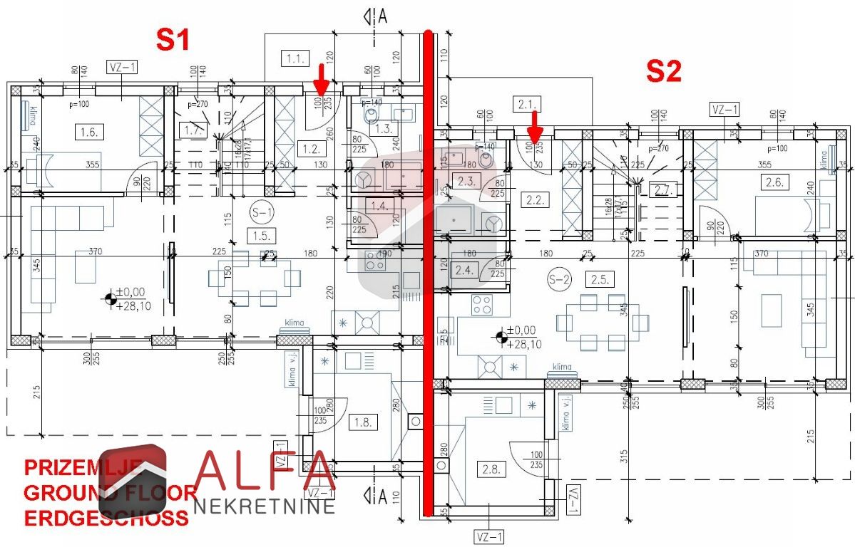 This beautiful family house marked as S2, consists of a ground floor and first floor, with total area of 170 m2 on both floors + garden od 222 m2 where is also a pool of 25 m2. There are as well two parking places in ownership, each of 12,50 m2. Overall, with calculation coefficients, the house has a usable area of 186,18 m2.
