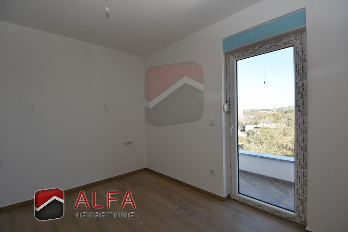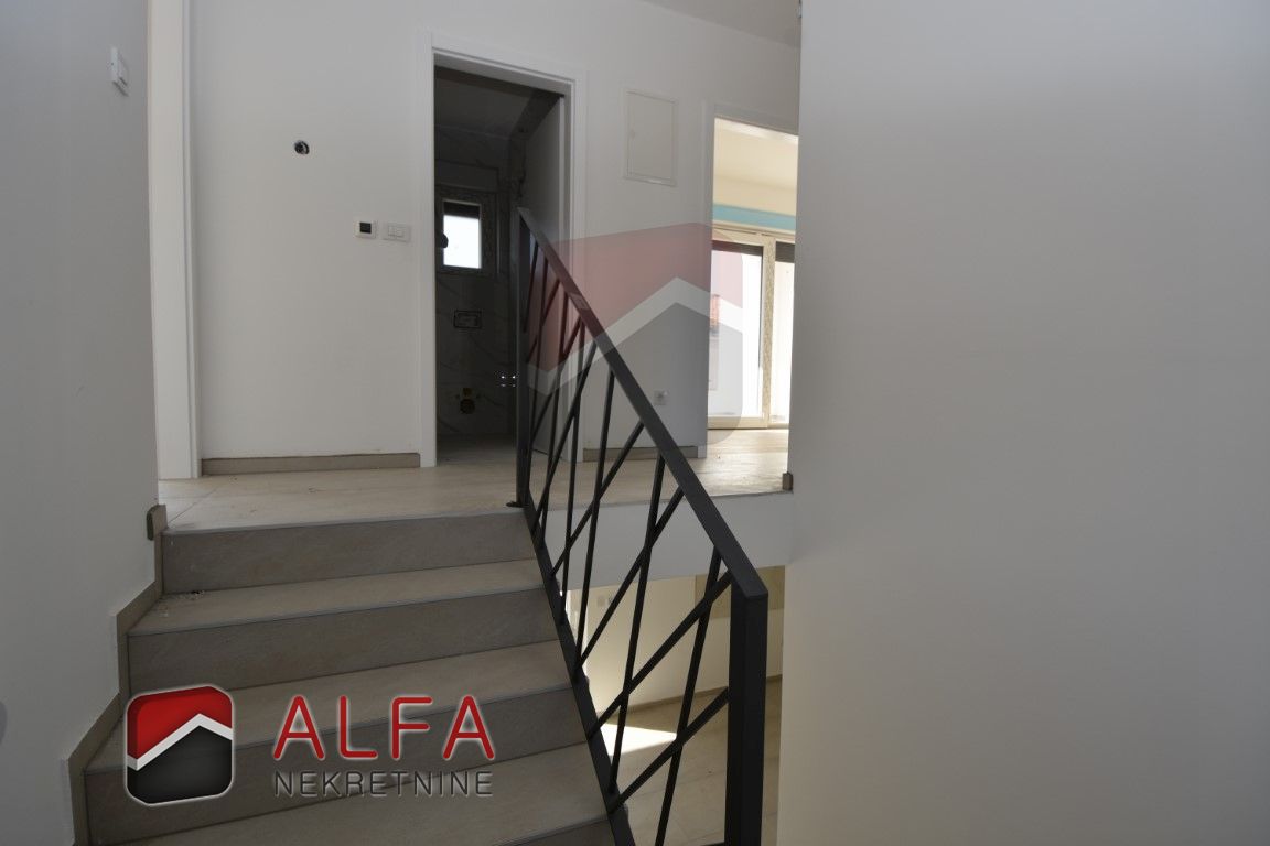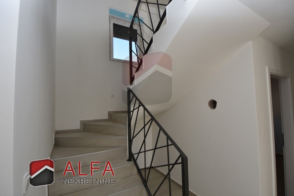 On the ground floor is covered entrance, hallway, bathroom, storage room, one bedroom, a kitchen with connected dining and living room with access to the terrace next to which is a separate summer kitchen. In front of and around the terrace is a garden with a swimming pool. Internal stairs lead to the first floor, where is a hallway, a bathroom, three bedrooms, one of which has its own bathroom. All three rooms have their own balcony.