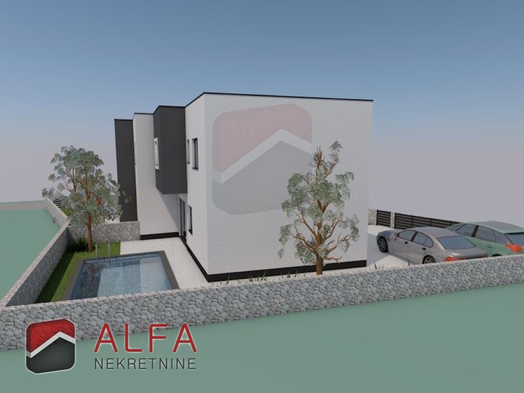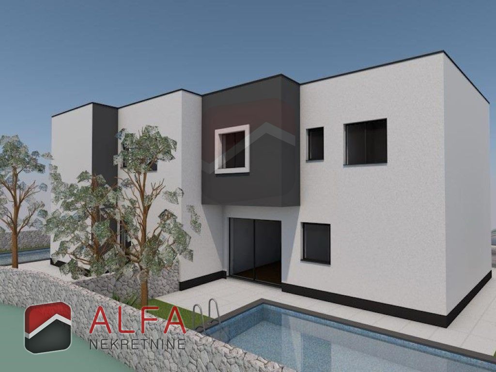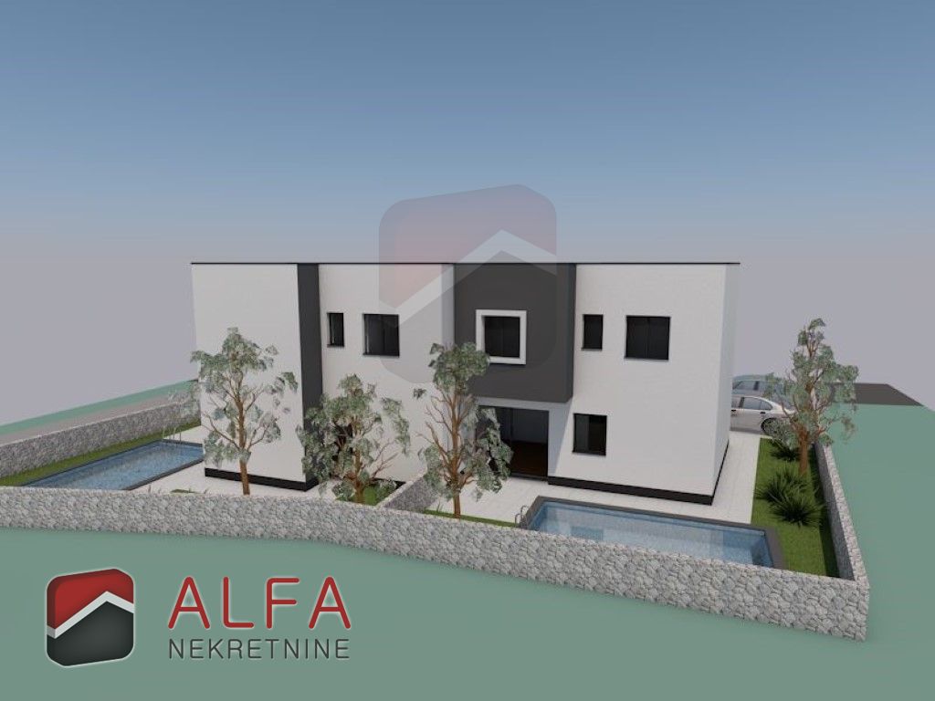 Croatia, Tribunj, a new semi-detached family house with a swimming pool is for sale, located close to the sea. The house features modern architecture and is only 140 metres from the coastline.