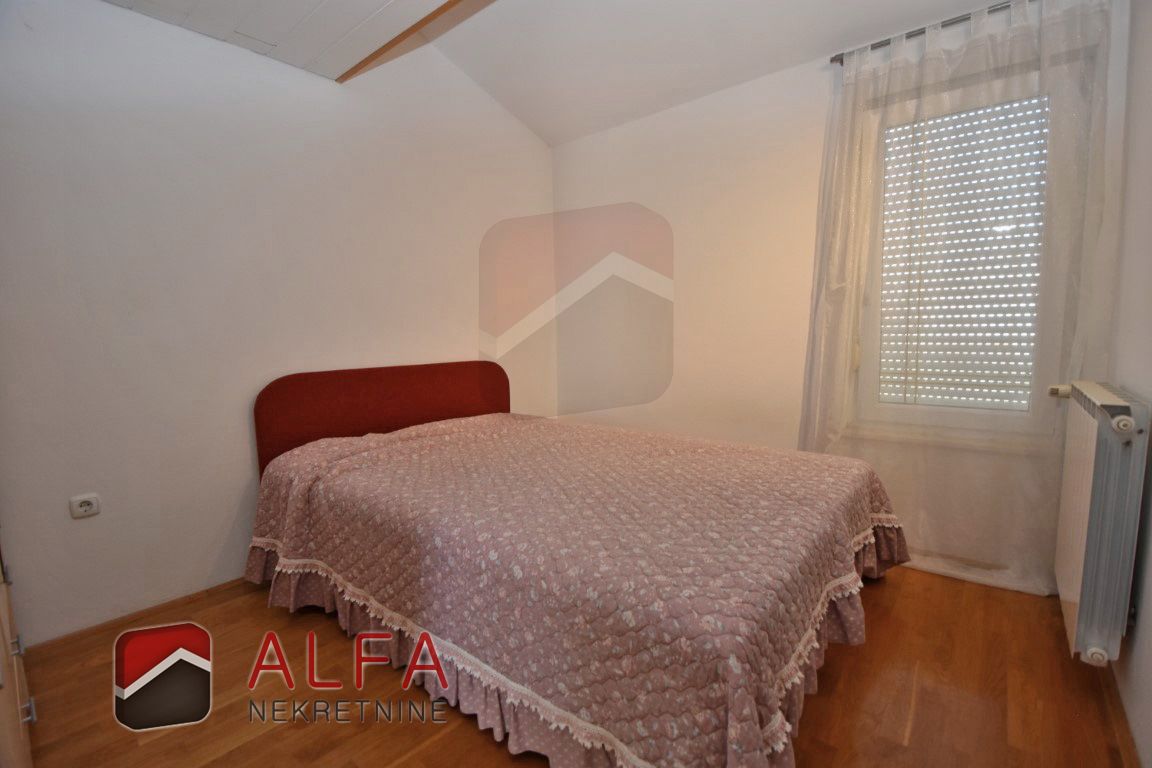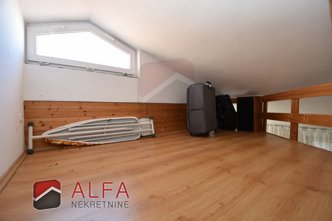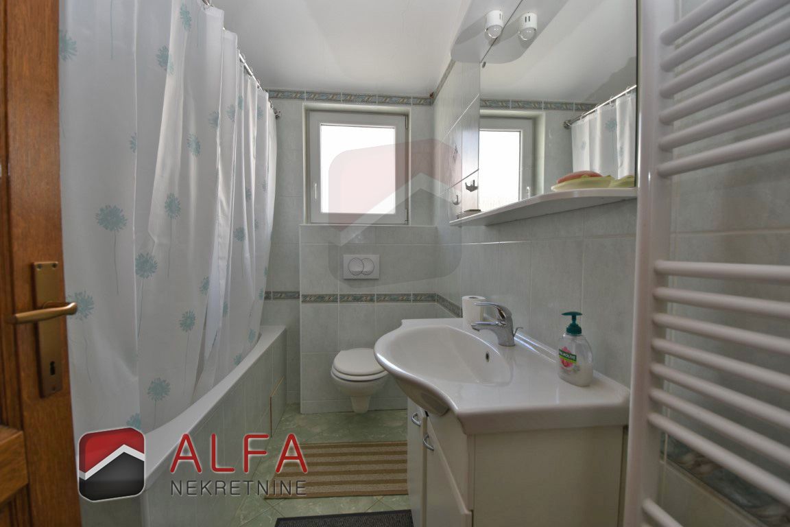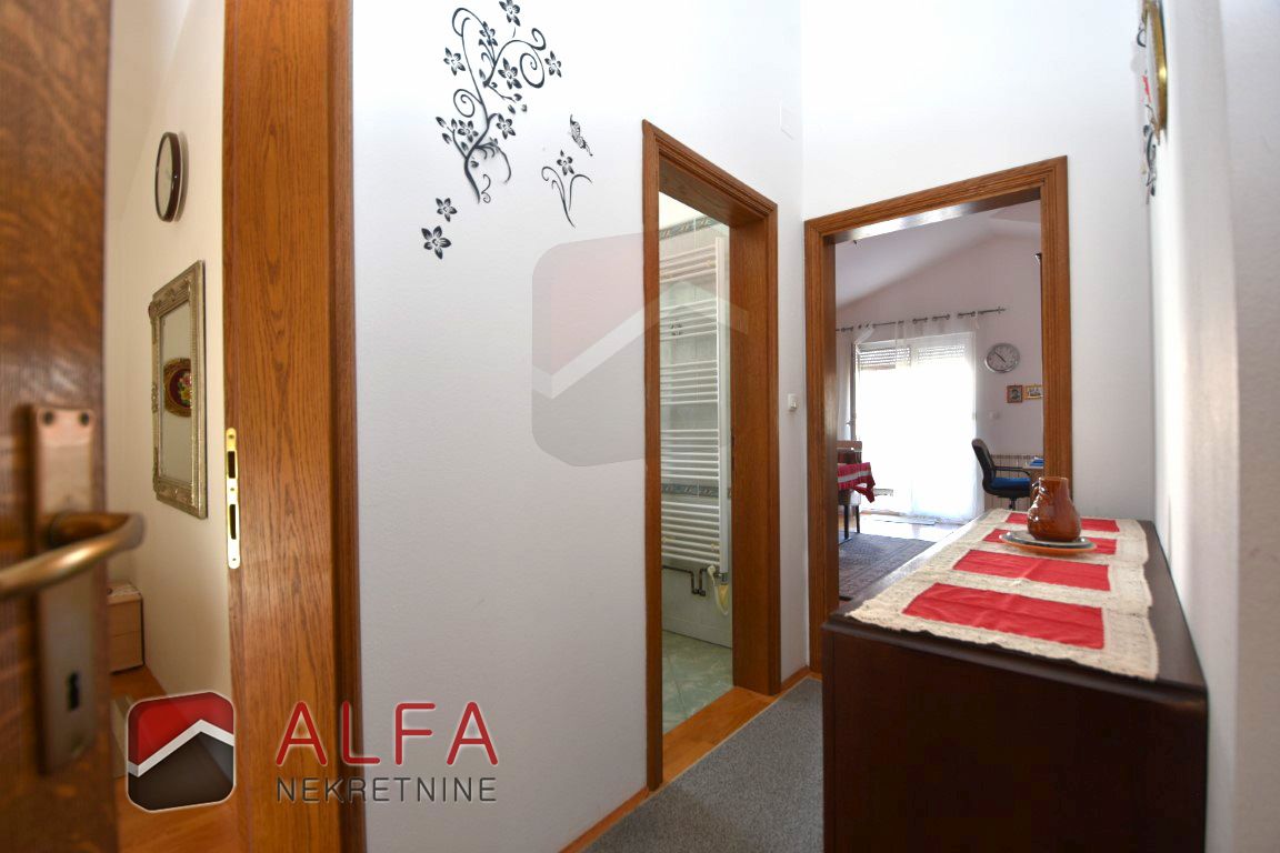 The house is interestingly designed – the main entrance leads to the high ground floor, to a spacious apartment that forms the central part of the house. On this high ground floor is a beautiful, spacious and comfortable apartment consisting of a hallway, one bedroom, bathroom, and an open-concept kitchen with a dining room and a living room – three connected, but spacious and functionally separate units. This apartment has two terraces, one in front of the entrance and one in front of the living room.