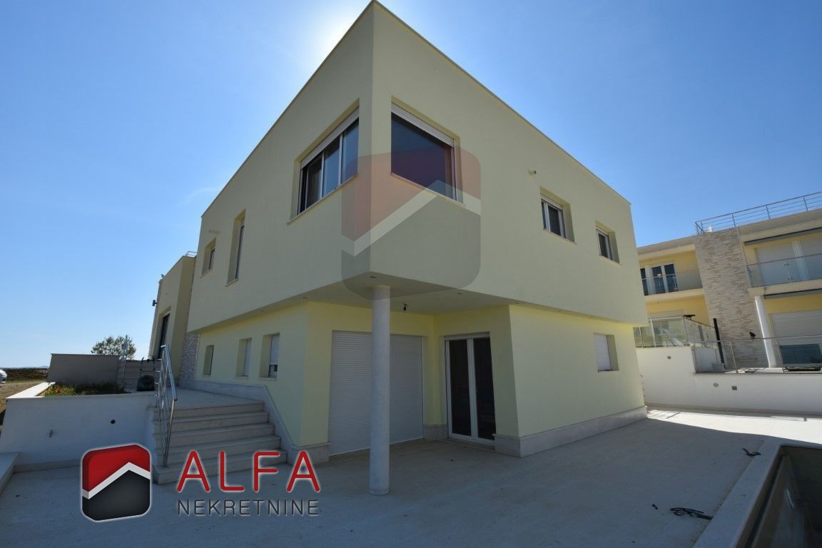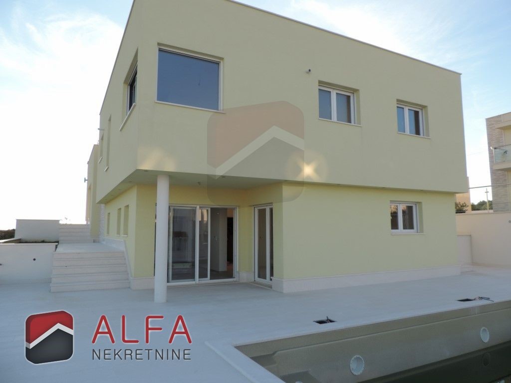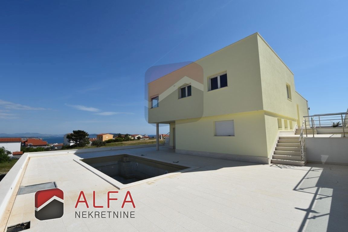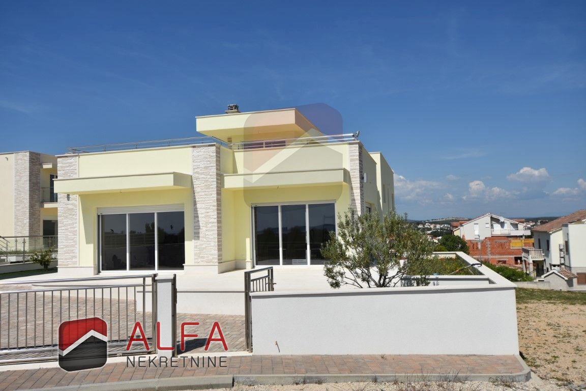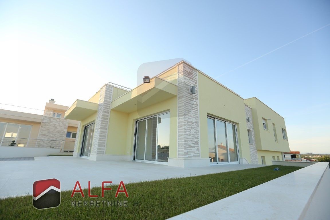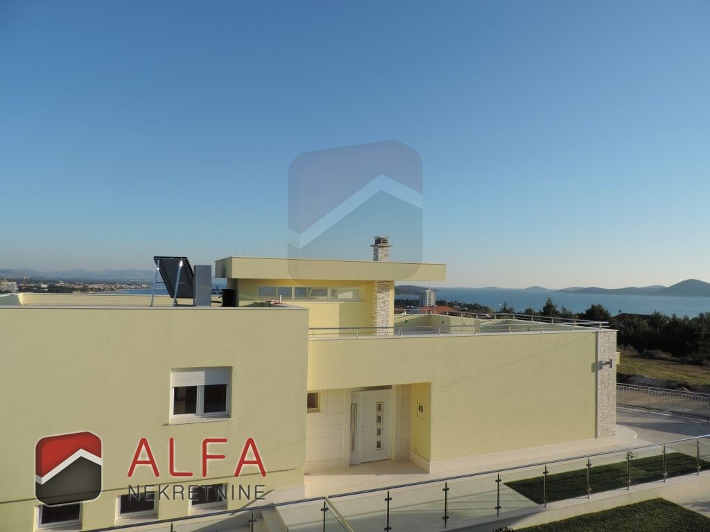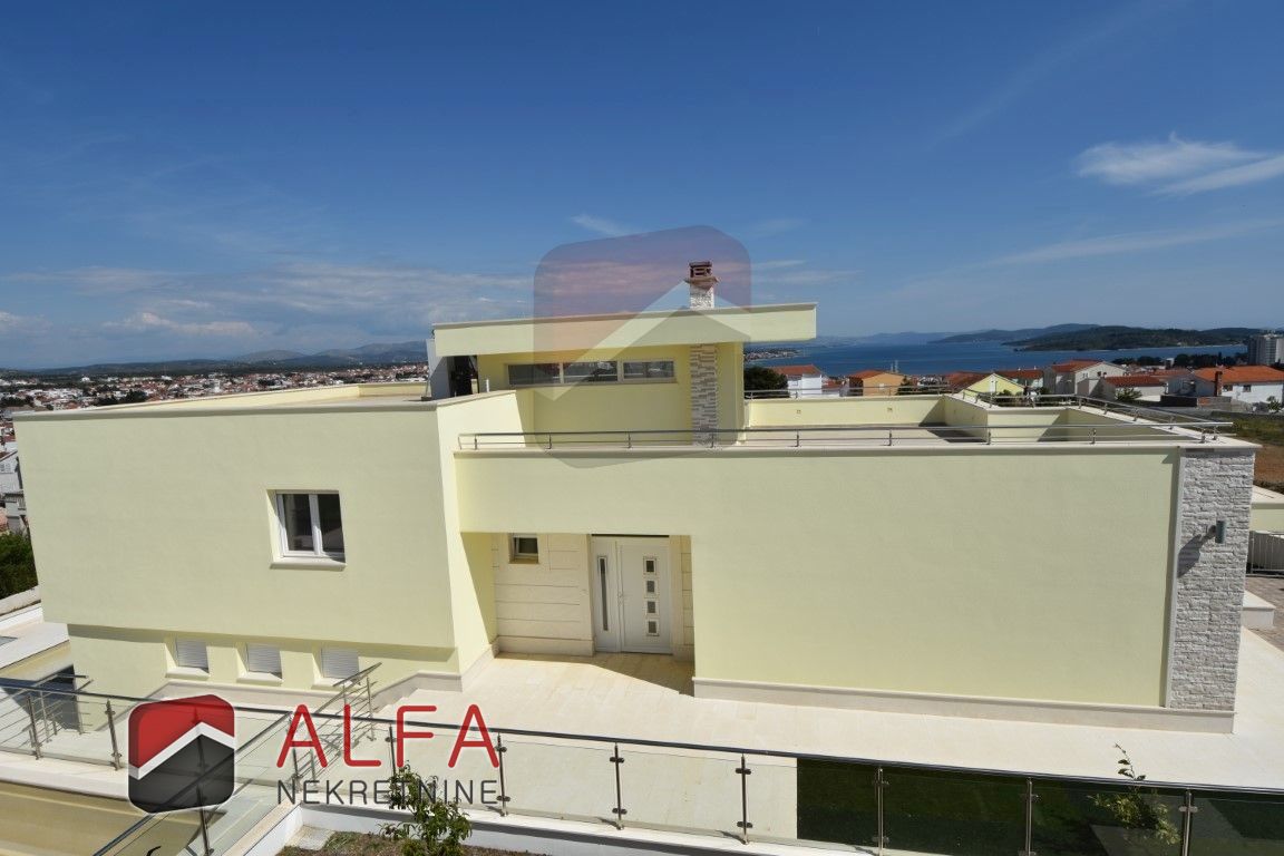 Croatia, Vodice, beautiful, new detached family house is for sale, 900 m far from the sea. It is located on a gentle slope and has a sea view from almost all rooms. This luxurious modern villa with a flat roof consists of a basement, ground floor and a large roof terrace. The total living area is 220 m2 + roof terrace of 76 m2. The house is located on a plot of 676 m2.