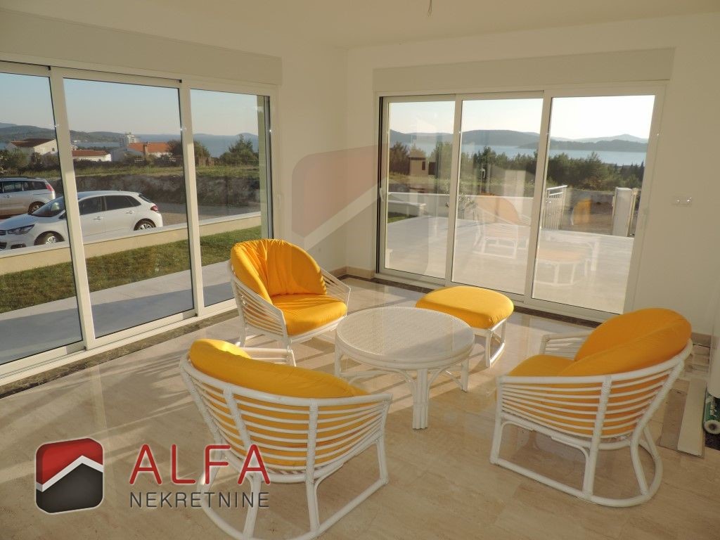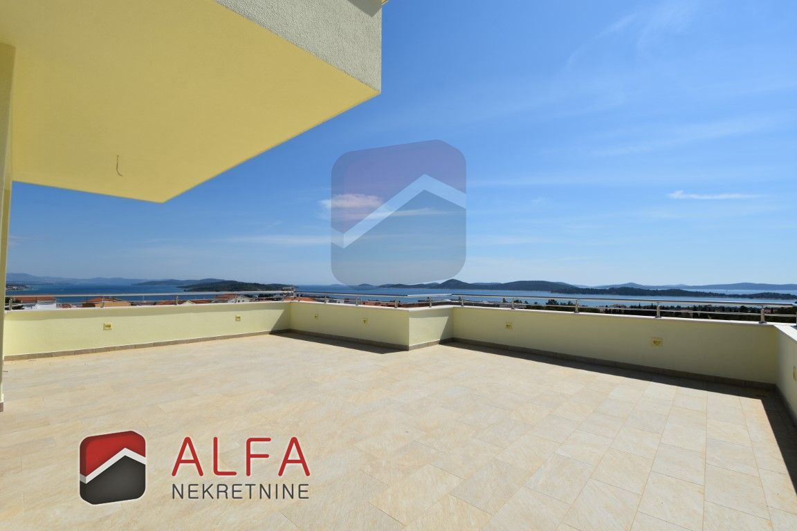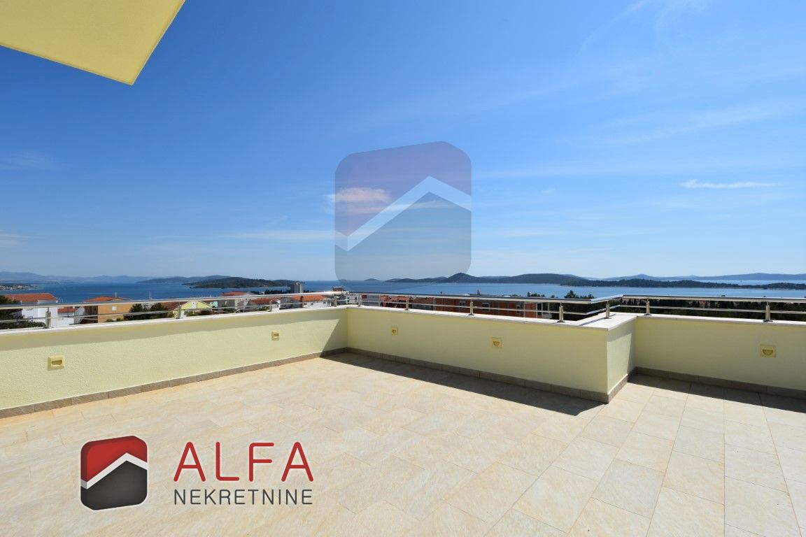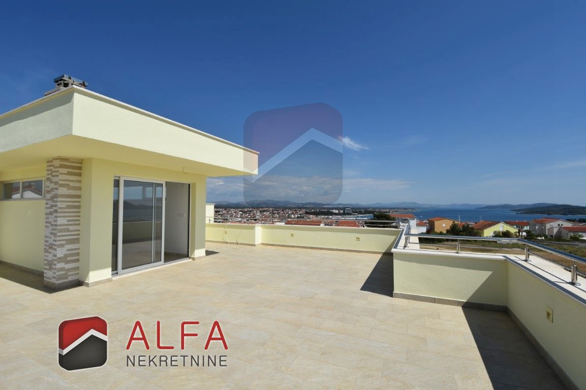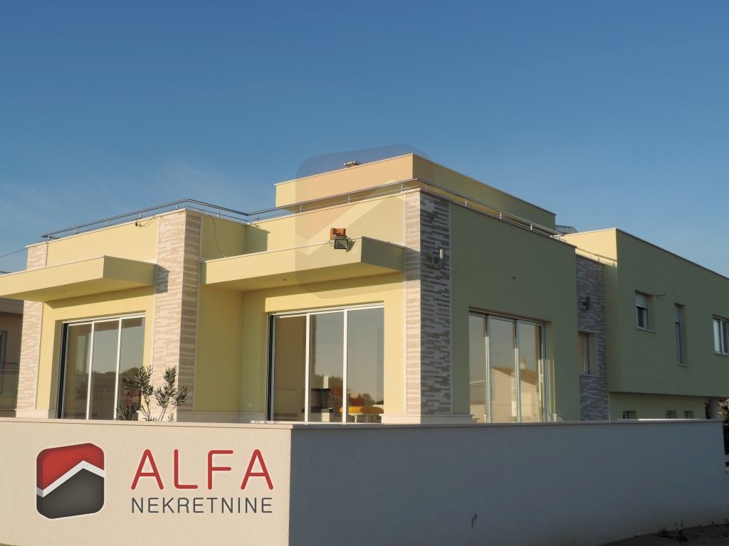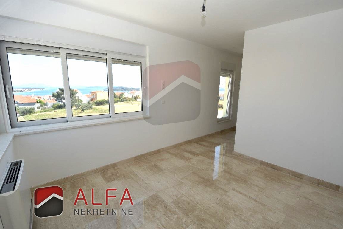 Croatia, Vodice, beautiful, new detached family house is for sale, 900 m far from the sea. It is located on a gentle slope and has a sea view from almost all rooms. This luxurious modern villa with a flat roof consists of a basement, ground floor and a large roof terrace. The total living area is 220 m2 + roof terrace of 76 m2. The house is located on a plot of 676 m2.