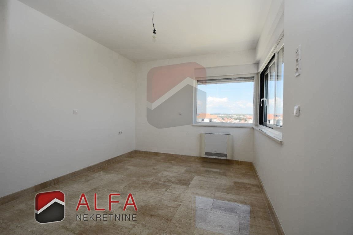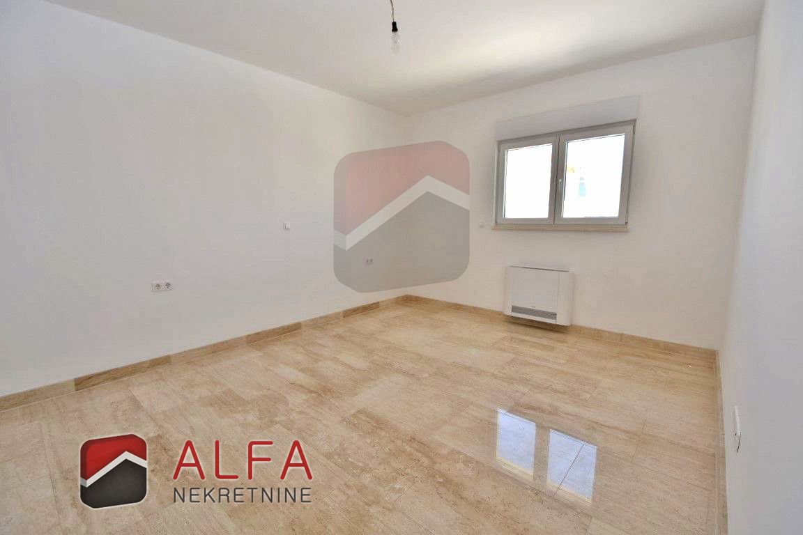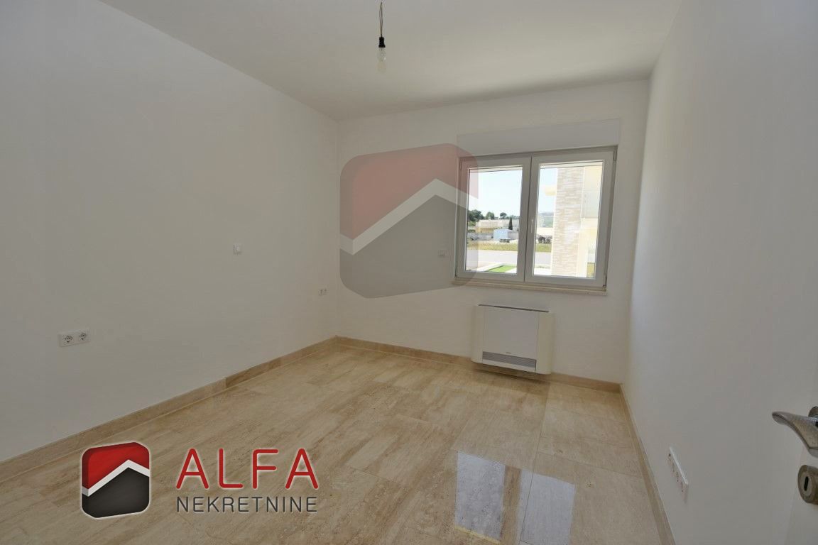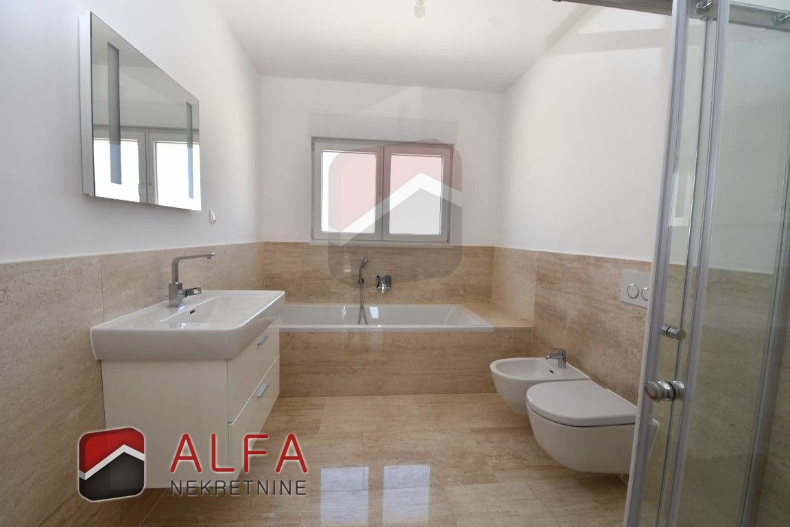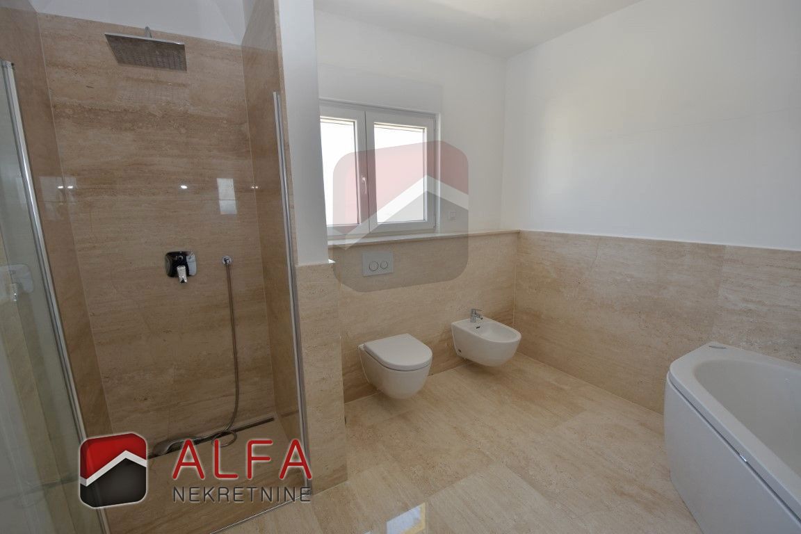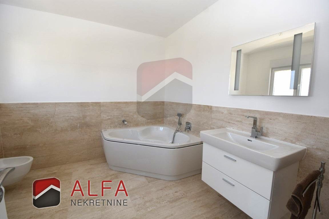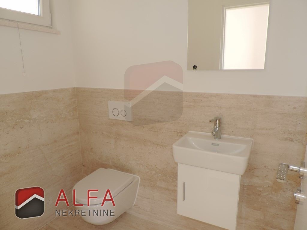 Croatia, Vodice, beautiful, new detached family house is for sale, 900 m far from the sea. It is located on a gentle slope and has a sea view from almost all rooms. This luxurious modern villa with a flat roof consists of a basement, ground floor and a large roof terrace. The total living area is 220 m2 + roof terrace of 76 m2. The house is located on a plot of 676 m2.