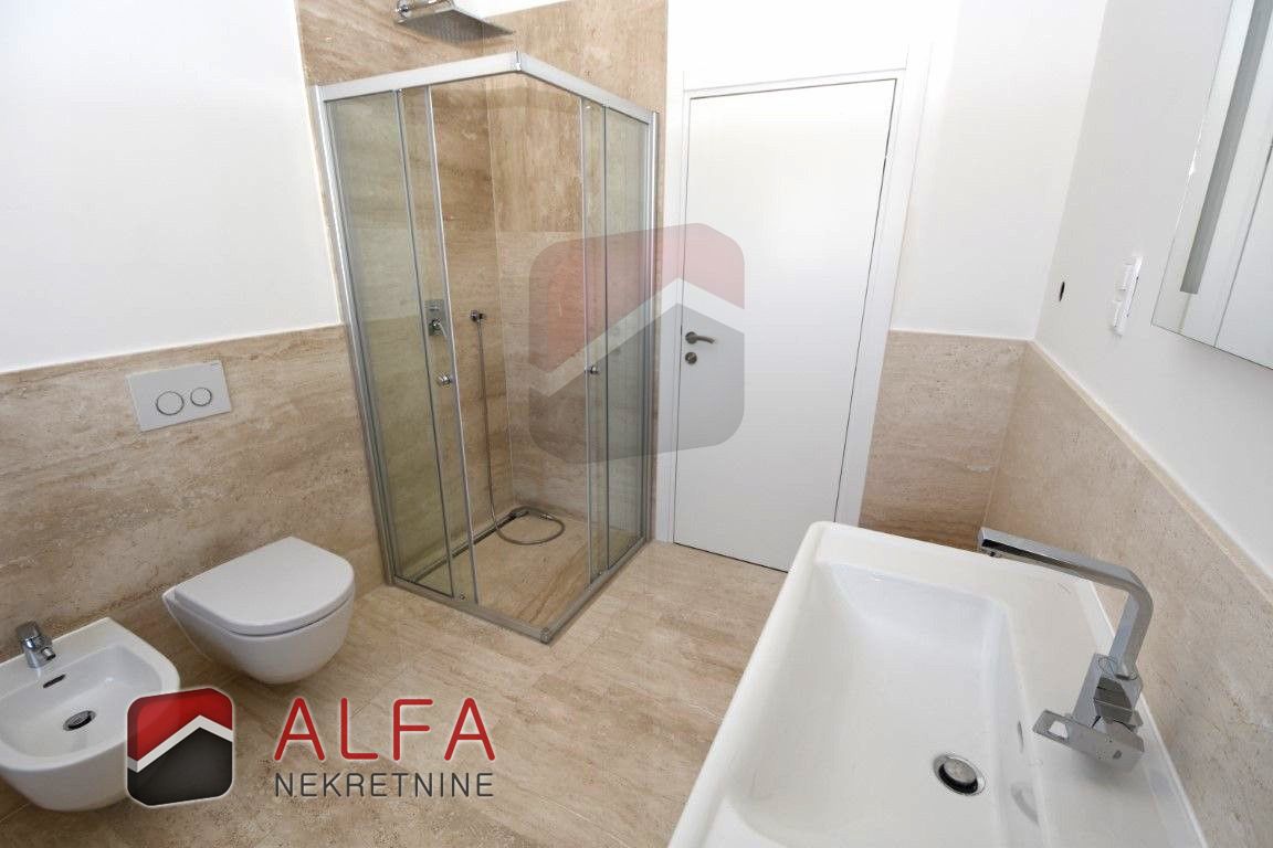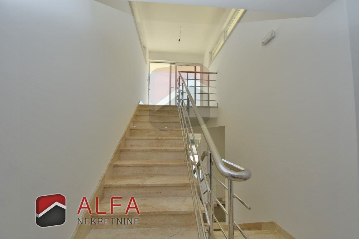 On the ground floor is a large luxury apartment consisting of two bedrooms, shared bathroom, third bedroom with its own wardrobe and bathroom, toilet, large hallway, open kitchen with large bright dining room with glass walls, and comfortable living room with fireplace and with access to a large terrace. All rooms are very sunny and bright and have a beautiful sea view.