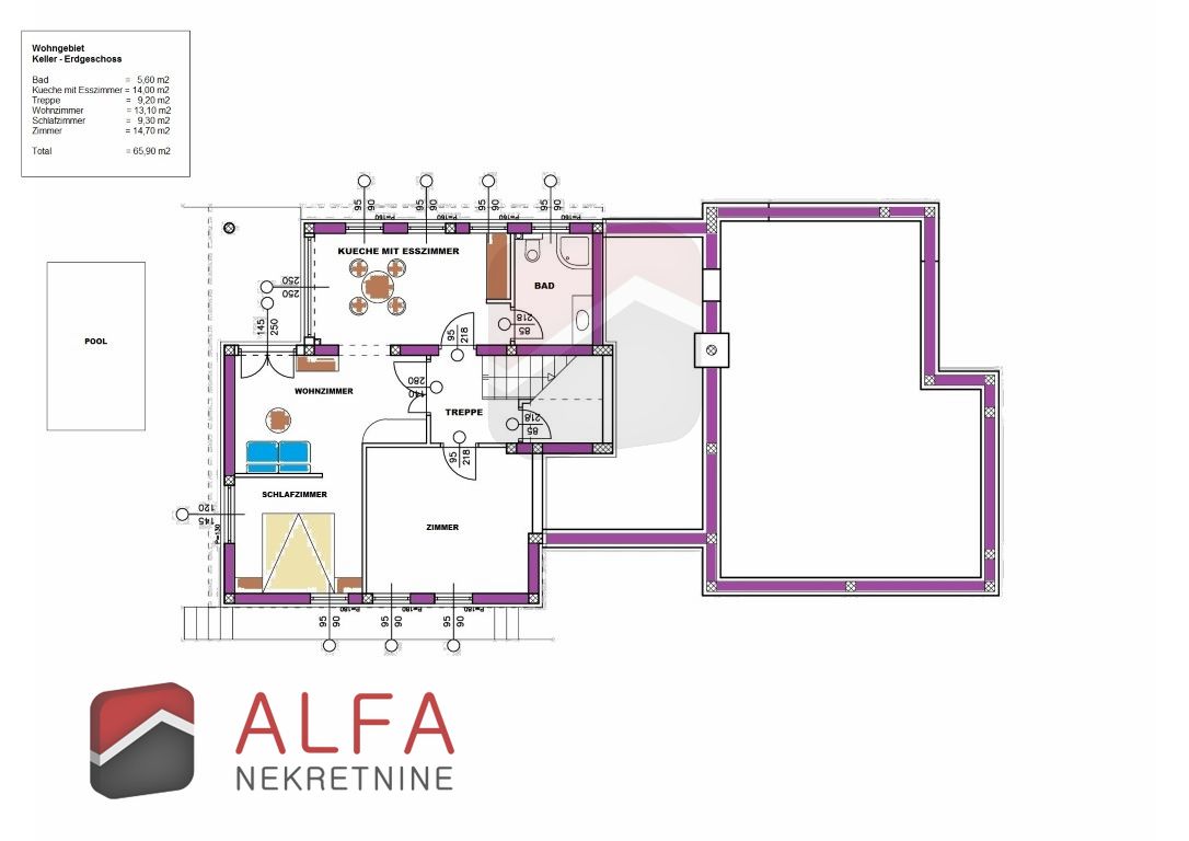 In the basement is an apartment for guests which consists of one bedroom, bathroom, hallway, kitchen with dining area and a spacious living room with access to the terrace and pool at the back side of the house.