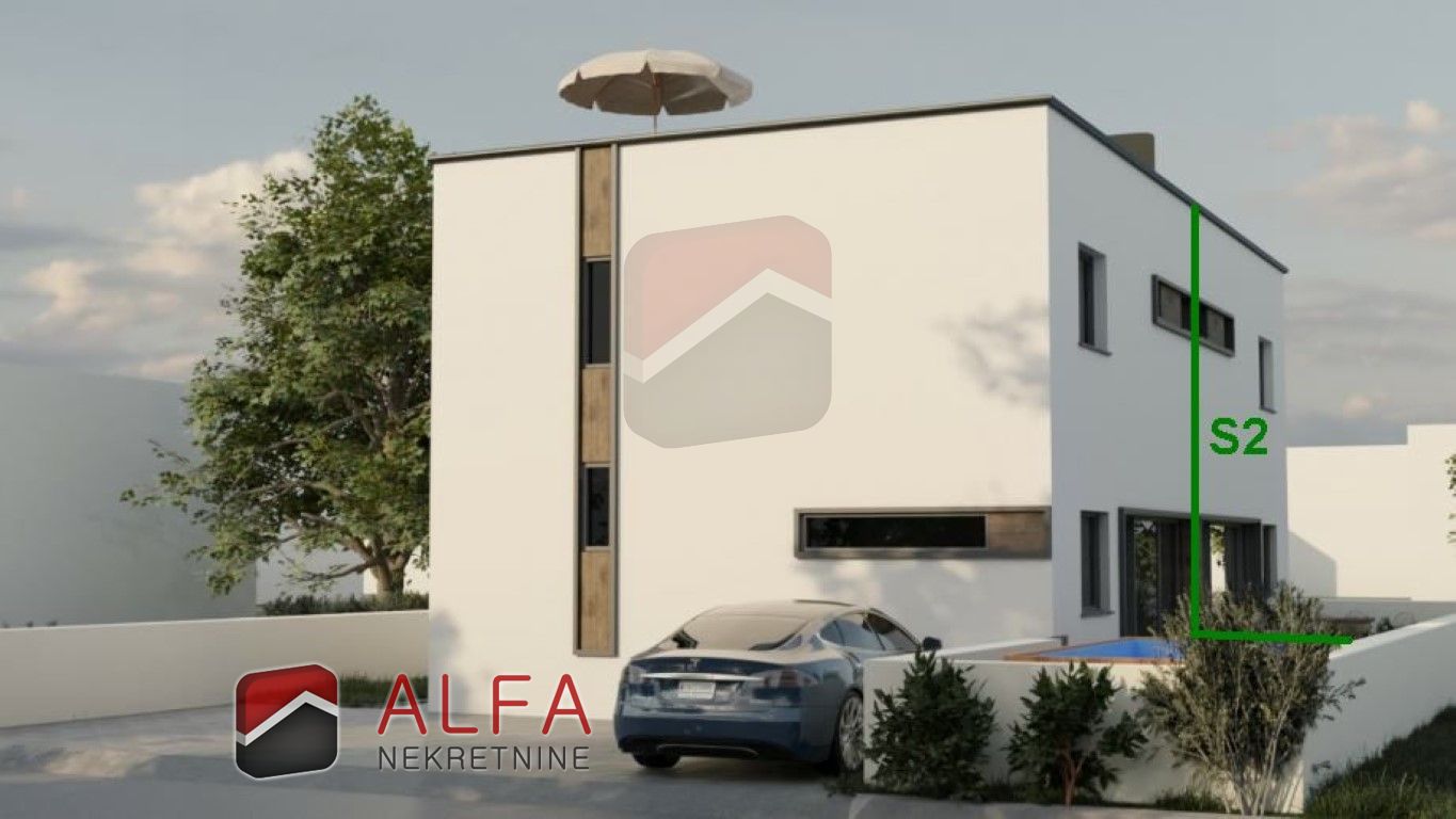 Croatia, Vodice, for sale is semi-detached house under construction in a quiet location. This beautiful small family house, which consists of a ground floor and an upper floor, has a total internal area of 77.5 m2 + yard of about 60 m2 + two parking spaces. It is 950 meters away from the sea.