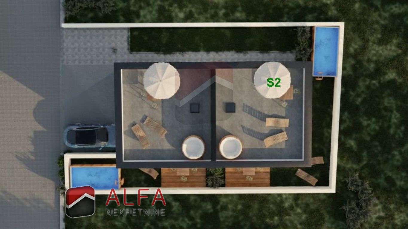 A jacuzzi can be installed in the landscaped front part of the yard, and there is space for parking two cars in the back part.