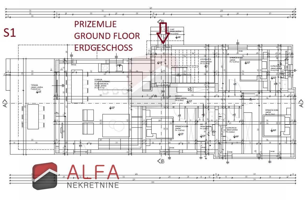 Apartment S1 is located on the ground floor of a building of modern architecture and extends through the entire floor, and it also has its own part of the yard. The apartment has an area of 106.76 m2 + its own garden of about 200 m2 + two parking spaces.