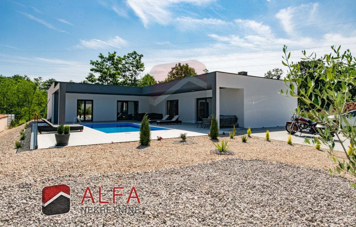 Labin okolica, prodaje se nova moderna samostojeća obiteljska kuća s bazenom. Ova nekretnina moderne arhitekture se nalazi u mirnom mjestu, udaljena 10 km od mora.