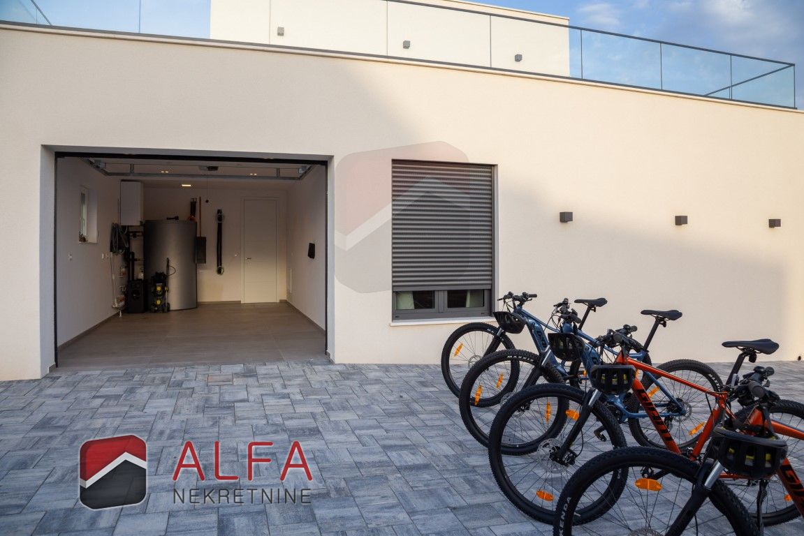 S bočne strane prizemlja kuće, nalazi se garaža s izravnim prolazom u unutrašnjost nekretnine, što olakšava pristup i svakodnevno korištenje. Na samom ulazu u kuću se nalazi prostrani ulazni hol, zaseban toalet, a u nastavku s desne strane slijedi prostrani dnevni boravak sa spojenom uređenom kuhinjom i blagovaonicom. Iz dnevnog boravka se ide na veliku natkrivenu terasu koja je spojena sa sunčalištem i impozantnim bazenom veličine 40 m2. Unutra u prizemlju lijevo od hodnika nalaze se još dvije spavaće sobe, svaka sa svojom kupaonicom.
