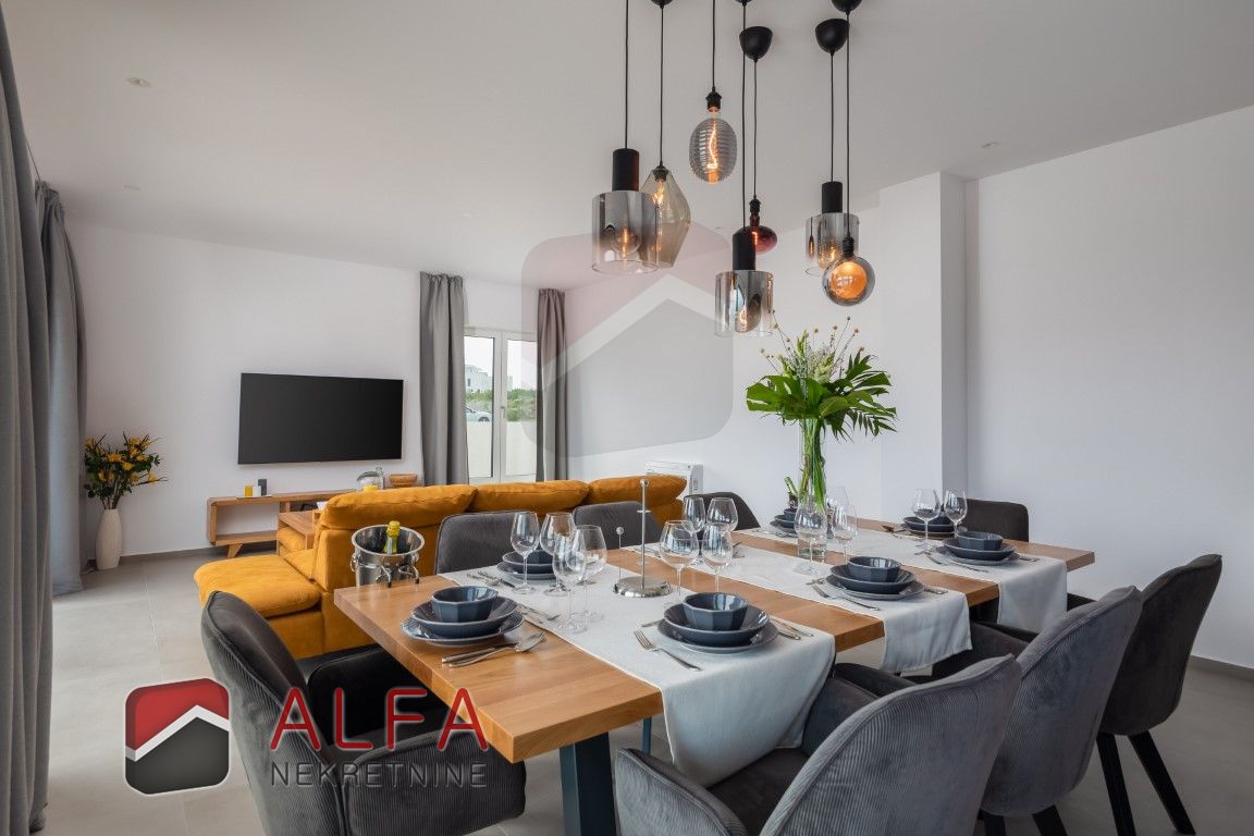Ispred kuće, u neposrednoj blizini bazena, nalazi se natkriveni prostor s vrhunski opremljenom vanjskom kuhinjom i roštiljem, savršen za ljetna druženja na otvorenom. Bazen je pravi luksuz, s ugrađenim protustrujnim plivanjem i slanom vodom, pružajući vrhunsko iskustvo plivanja i opuštanja. Pored bazena je pažljivo uređeno sunčalište s vanjskim tušem, koje nudi savršen ambijent za uživanje na otvorenom.