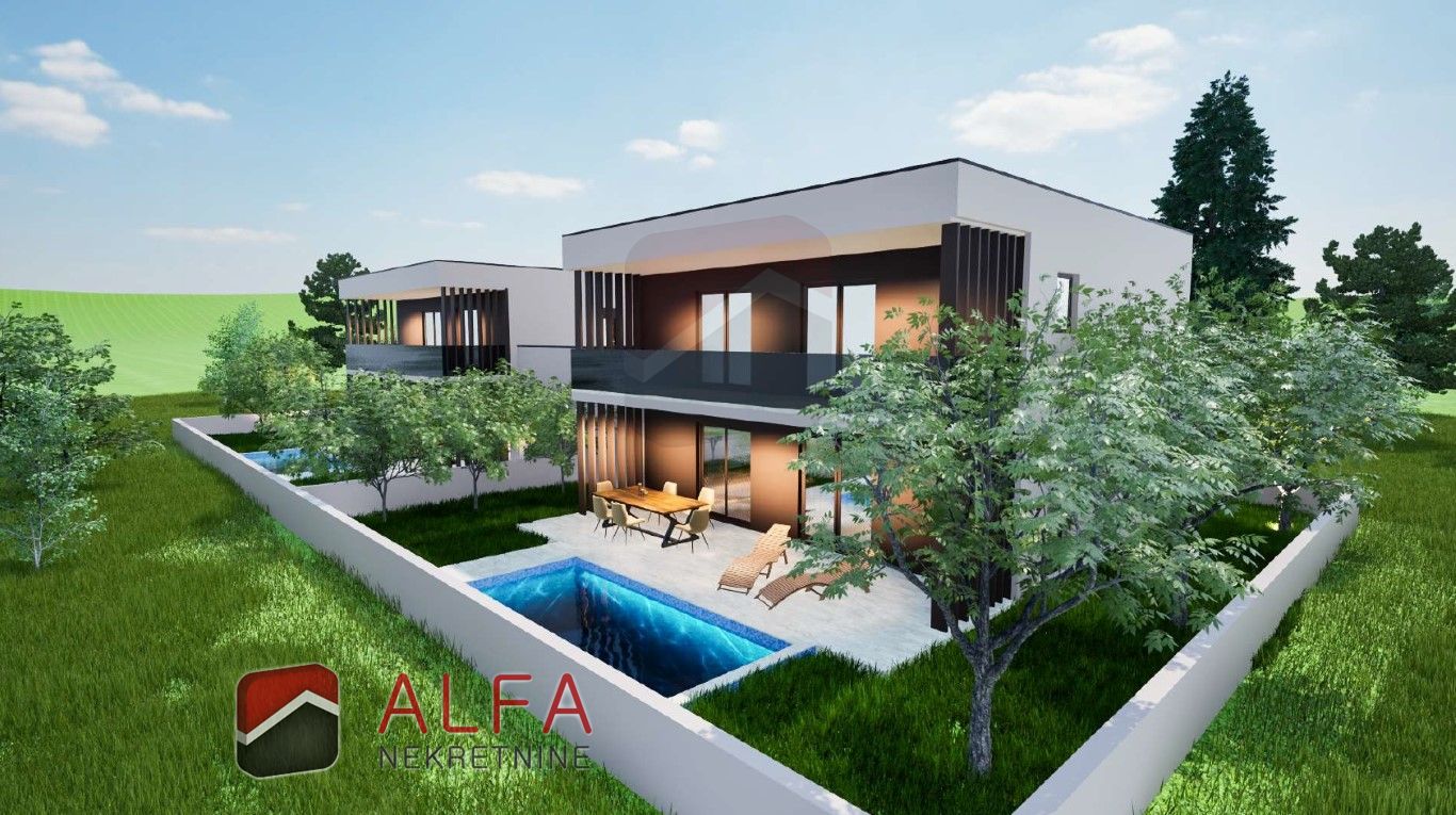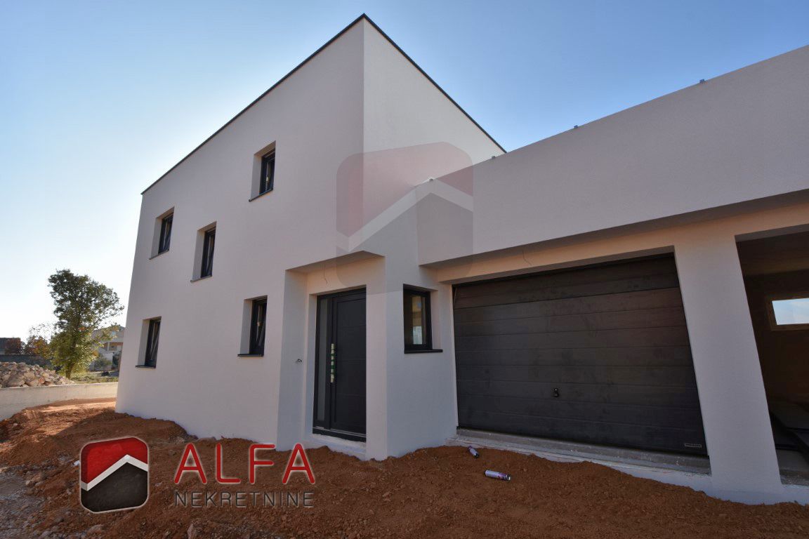 Vodice, prodaje se nova dvojna obiteljska kuća s bazenom i garažom. Kuća je moderne i arhitekture i udaljena je od mora 850 metara.