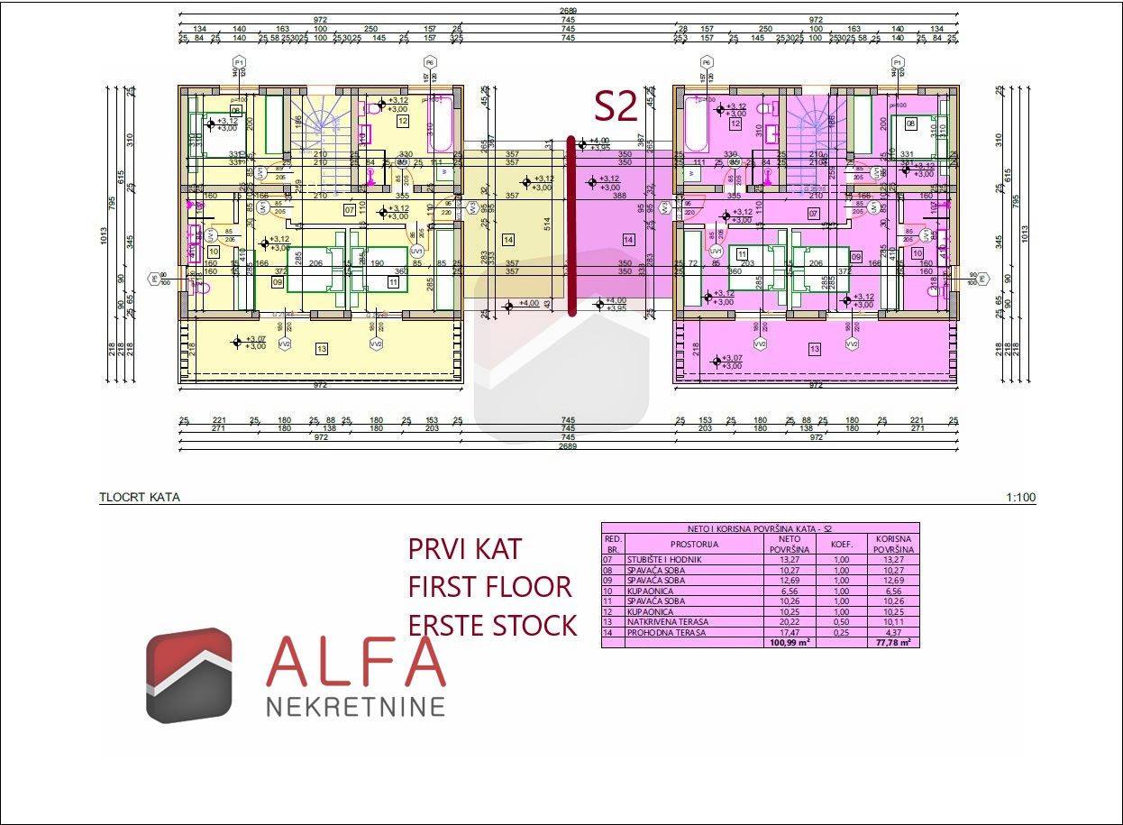 Kuća S2 se sastoji od prizemlja i kata, te sveukupno na obje etaže ima četiri spavaće sobe i tri kupaonice.