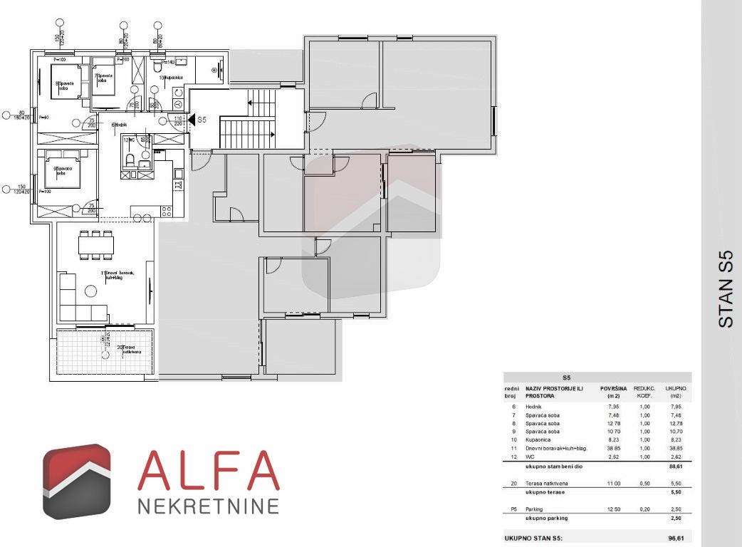 S5 se nalazi na prvom katu zgrade moderne arhitekture koja ima samo dvije etaže. Ovaj stan sadržava unutarnji stambeni prostor od 89,44 m2 + terasa 11,00 m2 + dva parkirna mjesta od 12,50 m2. Sveukupno sa koeficijentima stan ima ukupnu korisnu površinu od 99,94 m2.