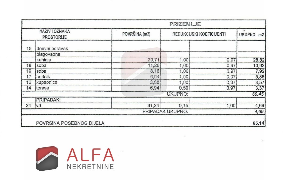 Stan ima unutarnju stambenu površinu od 60,45 m², a pripada mu i vlastito dvorište/vrt površine od 31,24 m², što ukupno, prema koeficijentima, čini 65,14 m² korisne vrijednosti površine. Ova kombinacija unutarnjeg i vanjskog prostora omogućuje ugodan boravak tijekom cijele godine, kao i uživanje na otvorenom u privatnosti vlastitog vrta.